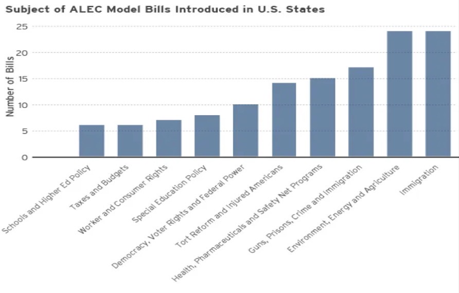 ALEC, The American Legislative Exchange Council, is a group of corporations and politicians who draft bills: bills made for corporations, by corporations. The process cannot be explained better than when former governor of Wisconsin, Tommy Thompson, in a luncheon speech to ALEC in 2002, said, “I always loved going to these meetings because I always found new ideas. Then I’d take them back to Wisconsin, disguise them a little bit, and declare that ‘It’s mine.” While we fall for the illusion of true democracy in our country, ALEC is pushing another bill through the mill that will not serve the American people— one they picked up at a luncheon or an all expenses paid vacation where our politicians take model bills from their corporate benefactors.